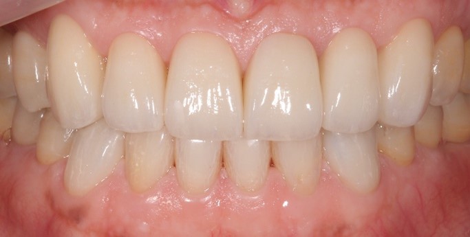 最初に両側下顎臼歯部にインプラントを行い、仮歯で咬合咀嚼を確保しました。治療期間を通して常に患者様の食生活と審美(QOL)を確保することがとても大切なことです。 その後噛み合わせを挙上して、反対咬合から正常咬合にすることで、顎のしゃくれ観がなくなり、顔貌が大きく改善しました。BOPT